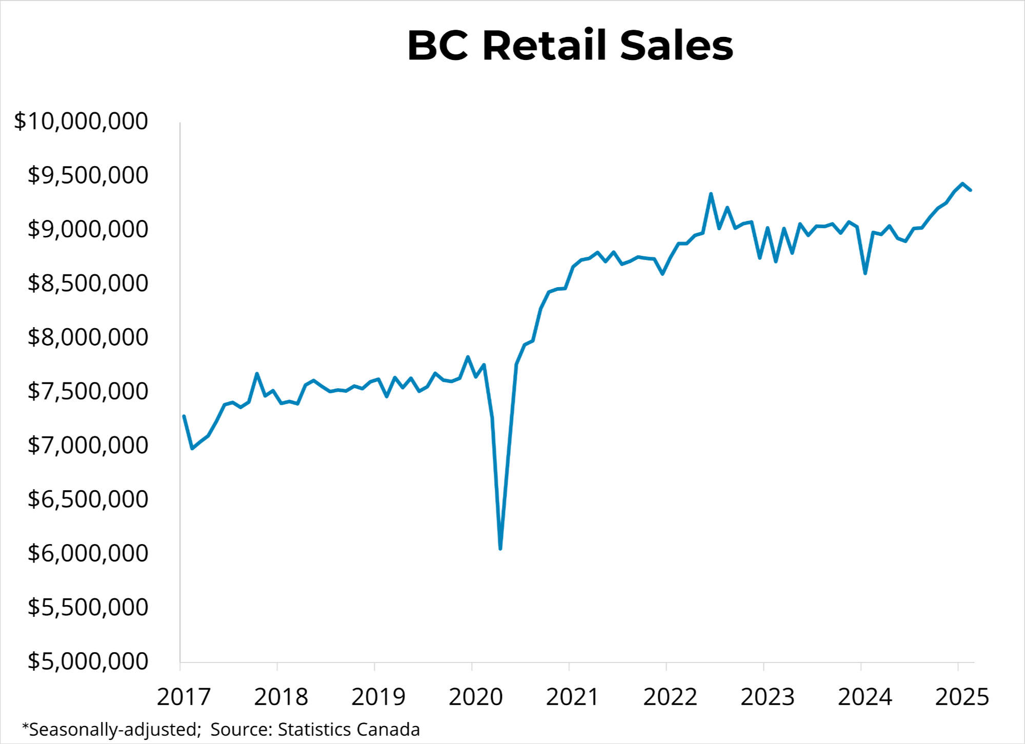 Analyzing retail data helps connect the dots to real estate market trends. The line graph tracking BC retail sales highlights resilience in consumer spending, despite periodic downturns. Retail recovery after the 2020 dip underscores an economic rebound that bolstered confidence in housing investments. However, fluctuations in recent months, including February's dip, signal caution among buyers.