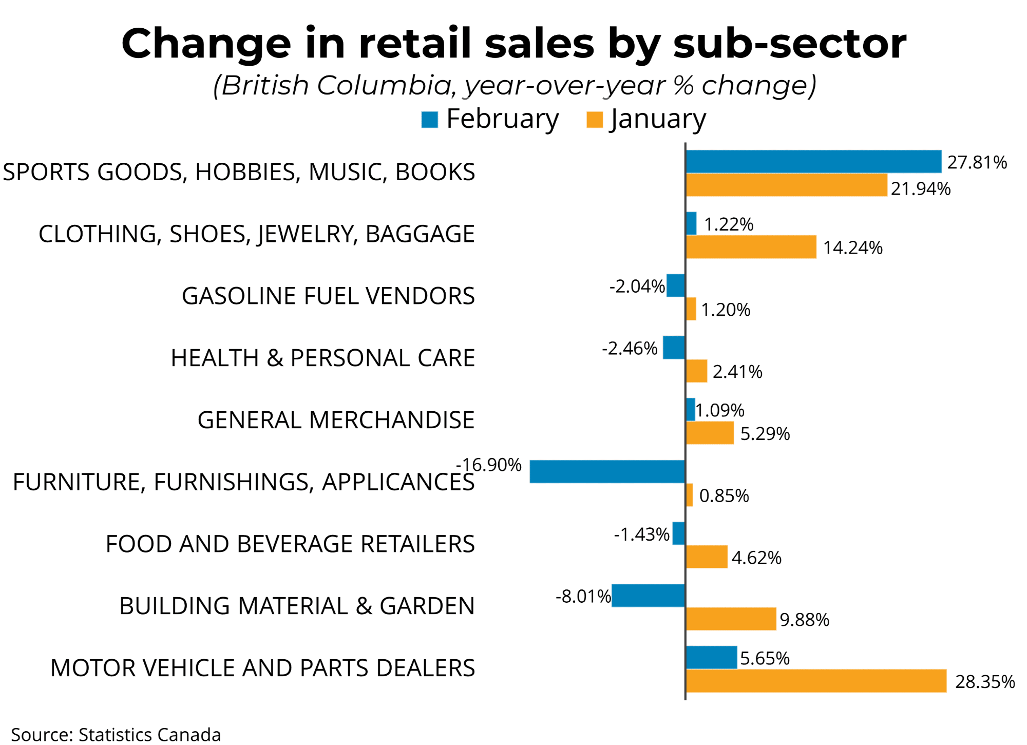 Canadian retail sales dipped by 0.4% to $69.3 billion month-over-month but rose 4.7% compared to last year. In British Columbia, sales fell by 0.6% from January but increased 4.4% year-over-year. Notably, Vancouver's CMA saw a sharper monthly decline of 0.9%, though still achieving impressive 6.0% growth compared to February 2024.